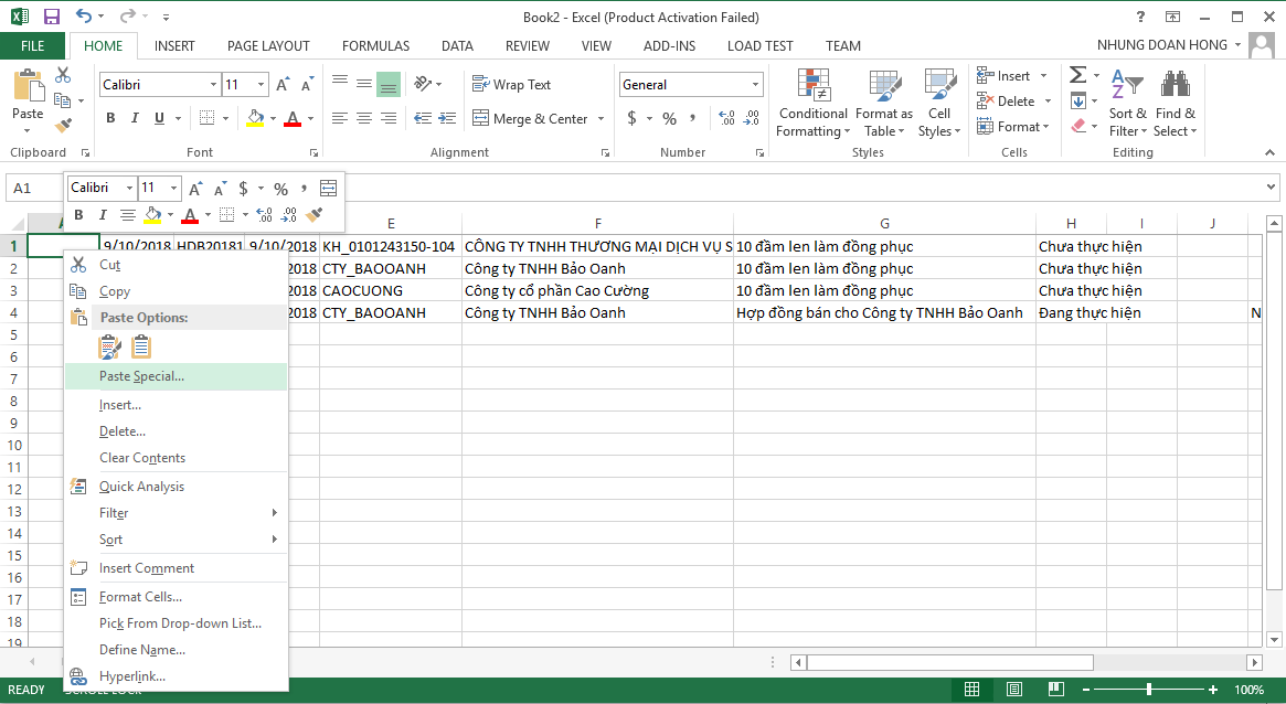 3. Paste danh sách hợp đồng vừa copy sang file Excel.