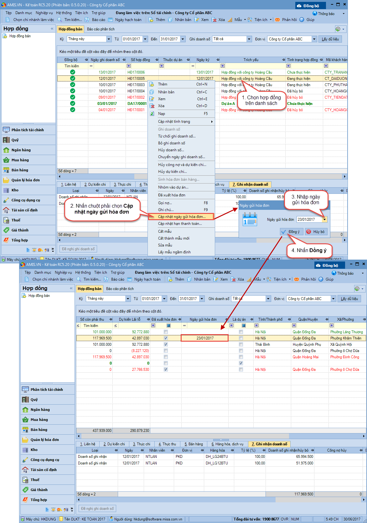 • Với các hợp đồng bán đã được xuất hóa đơn, kế toán có thể cập nhật ngày gửi hóa đơn cho các hợp đồng đó trên danh sách để thuận tiện trong công tác quản lý.