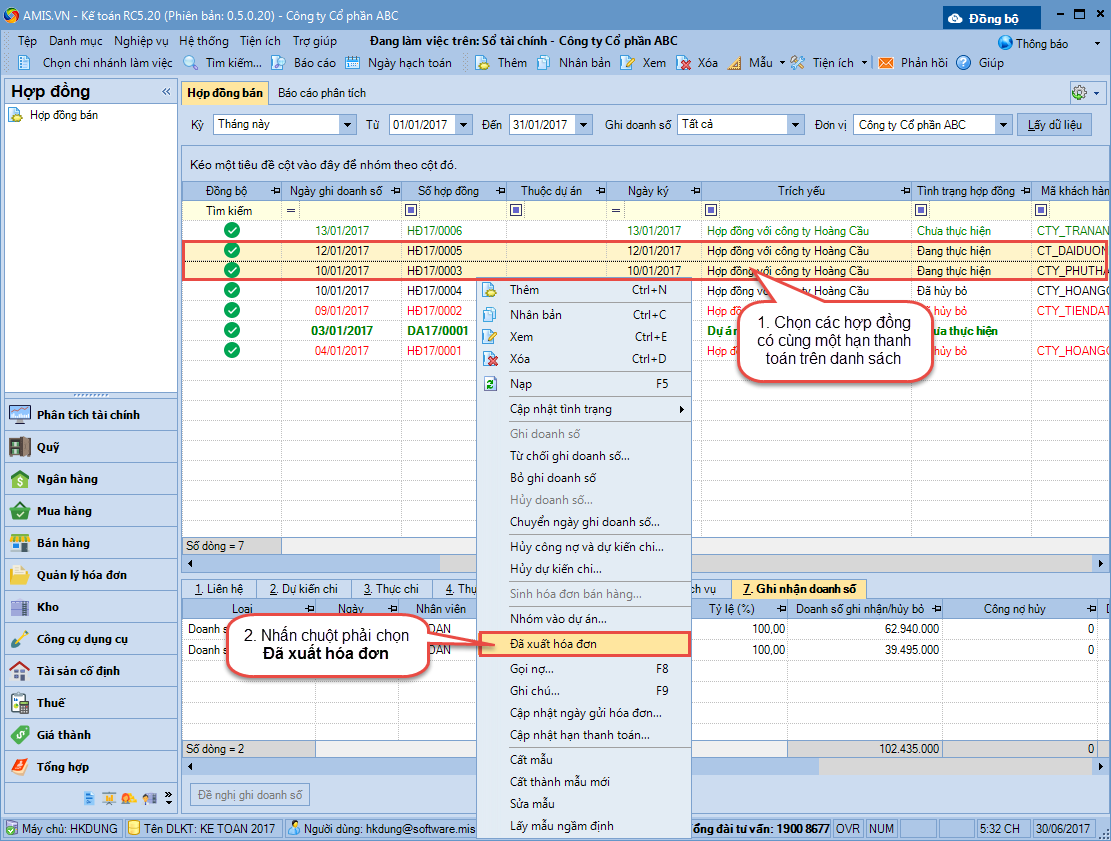 • Với các hợp đồng bán đã lập hóa đơn bán hàng, kế toán có thể tích chọn Đã xuất hóa đơn cho nhiều hợp đồng cùng lúc.