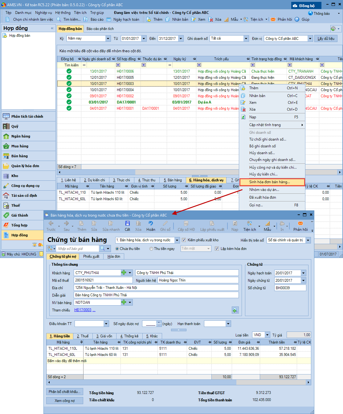 2. Nhấn chuột phải, chọn Sinh hóa đơn bán hàng, chương trình tự động sinh ra chứng từ bán hàng lấy theo thông tin trên Hợp đồng như: Khách hàng, Hàng hóa, dịch vụ.