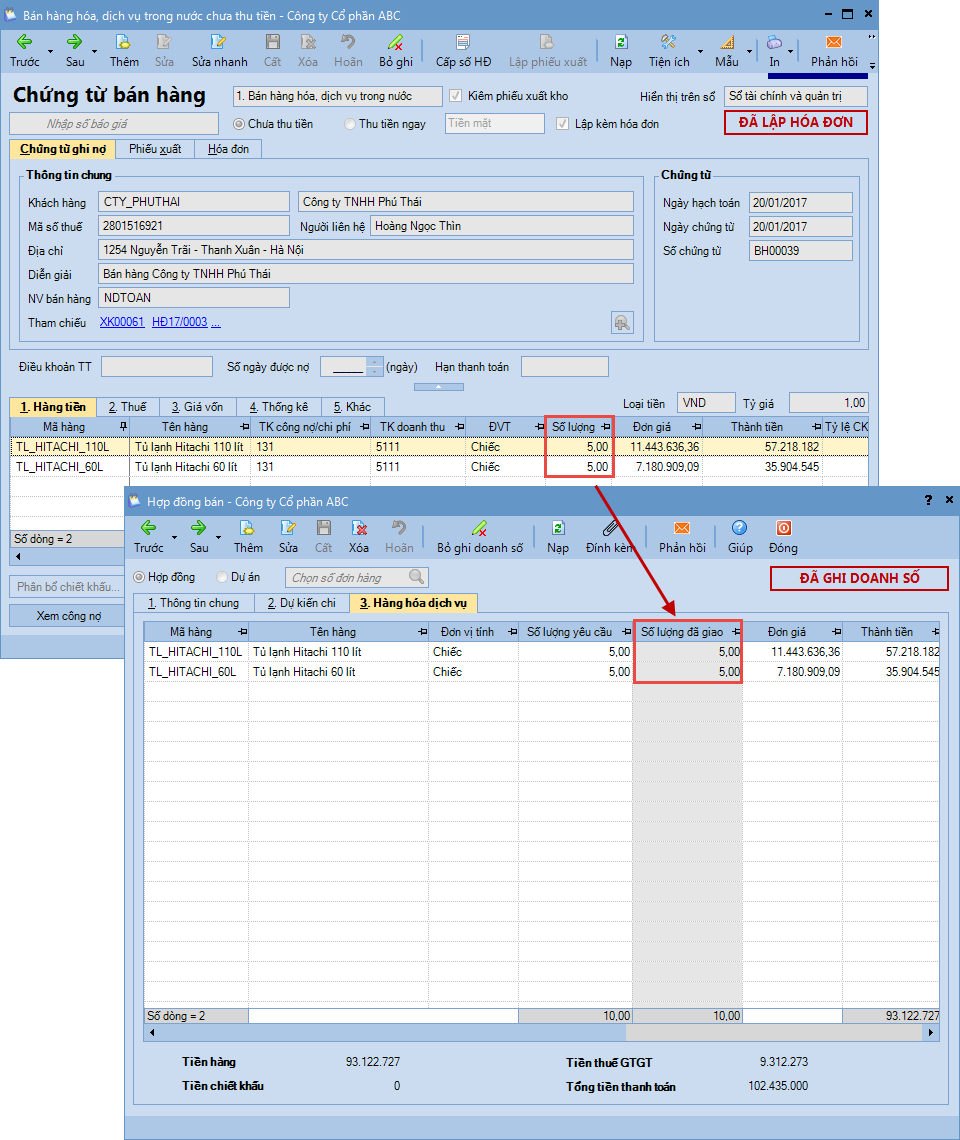 • Sau khi sinh hóa đơn bán hàng từ hợp đồng bán, chương trình sẽ tự động cập nhật lại thông tin Số lượng đã giao của VTHH trên hợp đồng.