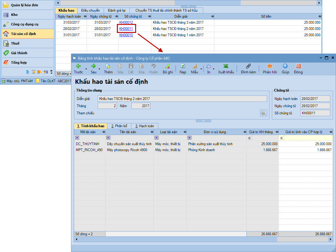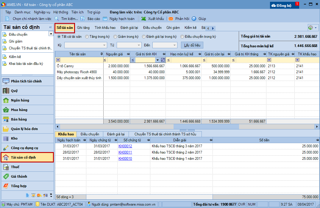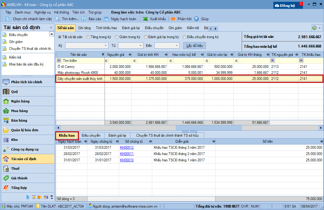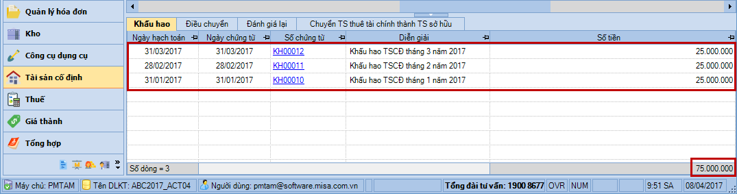 3. Xem nhanh tình hình trích khấu hao, điều chuyển, đánh giá lại, chuyển tài sản thuê tài chính thành tài sản sở hữu