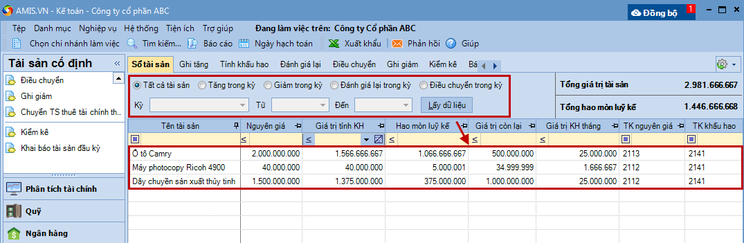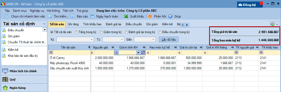 2. Xem nhanh thông tin Tổng giá trị tài sản và Tổng hao mòn lũy kế