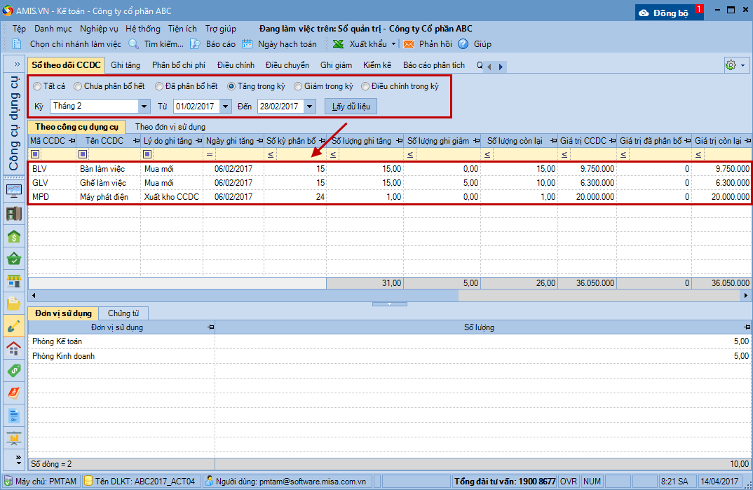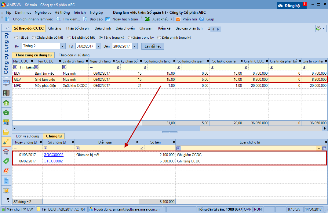 1. Vào phân hệ Công cụ dụng cụ, chọn tab Sổ theo dõi CCDC.