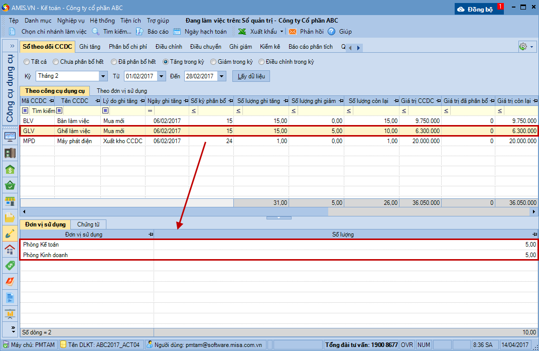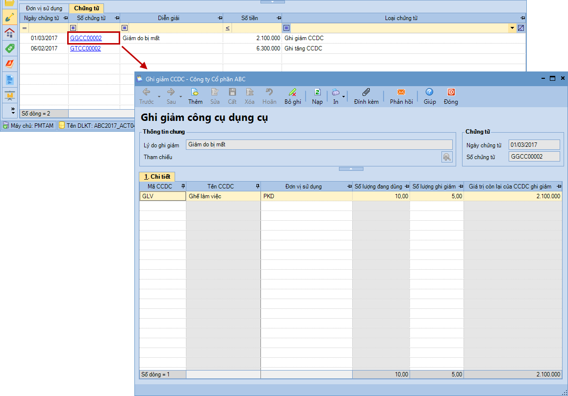 1. Chọn CCDC trên danh sách tại tab Theo công cụ dụng cụ.