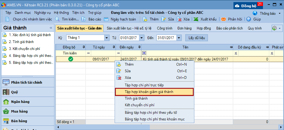 1. Vào phân hệ Giá thành\tab Sản xuất liên tục - Giản đơn (hoặc Sản xuất liên tục - Hệ số, tỷ lệ).