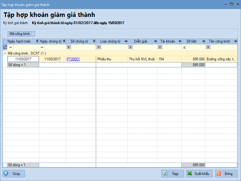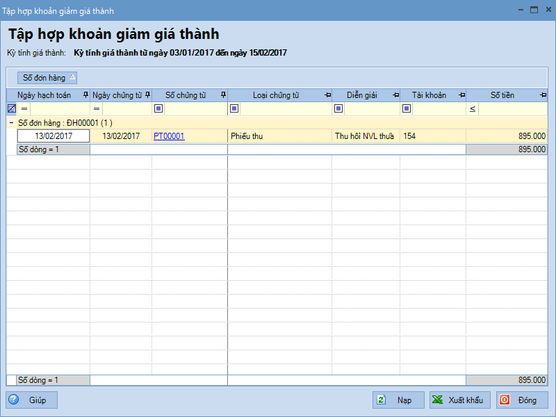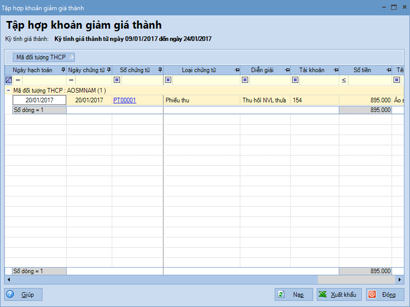 Có thể xuất khẩu bảng tập hợp các khoản giảm giá thành ra tệp excel bẳng cách chọn chức năng Xuất khẩu.