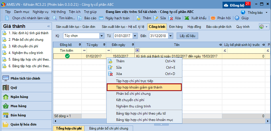 2. Chọn kỳ tính giá thành từ danh sách, sau đó nhấn chuột phải chọn Tập hợp khoản giảm giá thành.