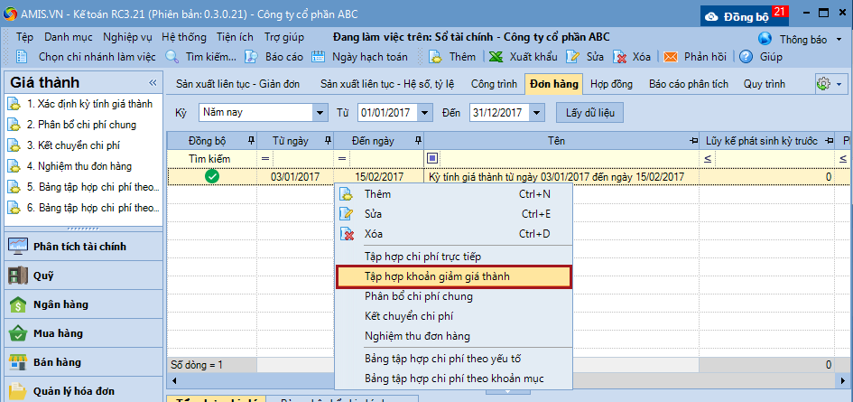 1. Vào phân hệ Giá thành\tab Đơn hàng.