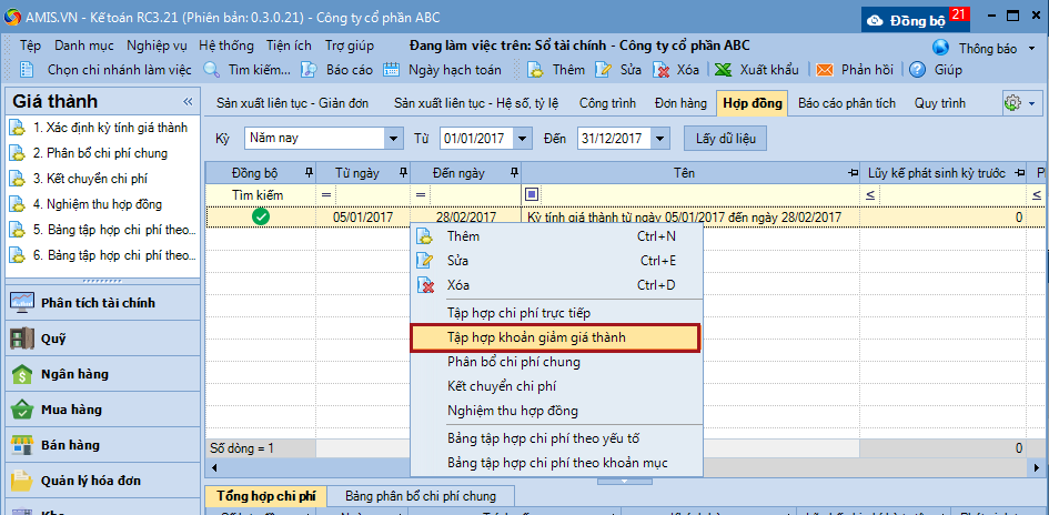 1. Vào phân hệ Giá thành\tab Hợp đồng.