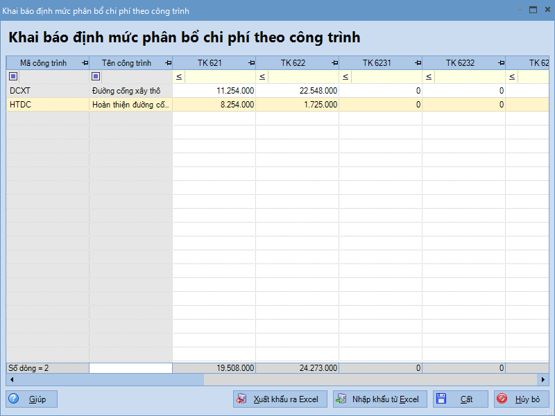 2. Nhập định mức chi phí vào các cột nguyên vật liệu, nhân công, khấu hao, chi phí mua ngoài, chi phí khác... theo từng công trình đã được khai báo trên danh mục Công trình.