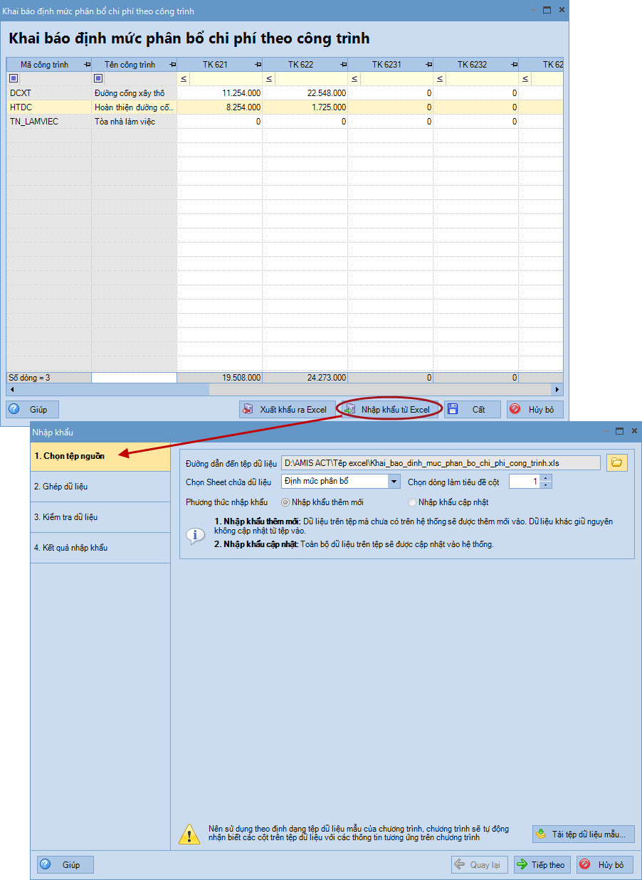• Có thể khai báo định mức cho nhiều công trình cùng lúc bằng cách sử dụng chức năng Nhập khẩu từ excel. => Chi tiết hướng dẫn các bước thực hiện, xem tương tự tại đây.