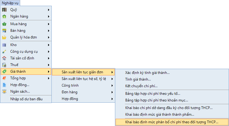 1. Vào menu Nghiệp vụ\Giá thành\Sản xuất liên tục giản đơn (hoặc Sản xuất liên tục hệ số, tỷ lệ), chọn Khai báo định mức phân bổ chi phí theo đối tượng THCP.