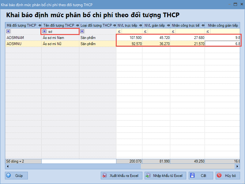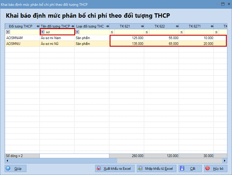 2. Lọc ra các đối tượng THCP cần thiết lập định mức phân bổ.