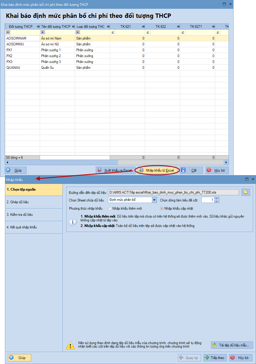 Có thể khai báo định mức cho nhiều đối tượng tập hợp chi phí cùng lúc bằng cách sử dụng chức năng Nhập khẩu từ excel. => Chi tiết hướng dẫn các bước thực hiện, xem tương tựtại đây.