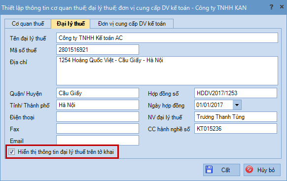 Tích chọn ô Hiển thị thông tin đại lý thuế trên tờ khai.