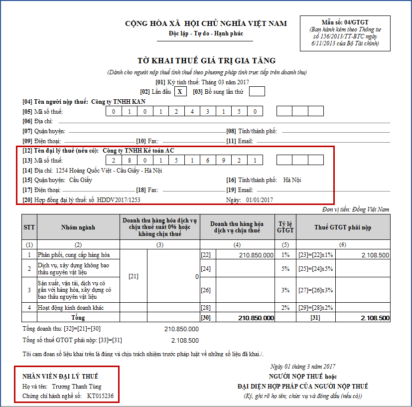 Tờ khai thuế in ra sẽ thể hiện thông tin đại lý thuế đã khai báo ở trên.