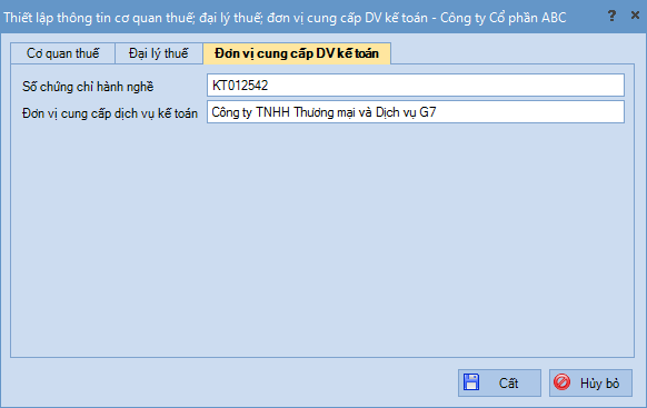 Giúp thiết lập các thông tin như thông tin đại lý thuế để in lên báo cáo thuế trong trường hợp đơn vị thuê đại lý thuế kê khai thuế; thông tin đơn vị cung cấp dịch vụ kế toán để in lên báo cáo tài chính trong trường hợp đơn vị thuê đơn vị cung cấp dịch vụ kế toán lập báo cáo tài chính; thông tin cơ quan thuế phục vụ cho việc in báo cáo thuế từ phần mềm và nộp cho cơ quan thuế qua phần mềm HTKK hoặc ứng dụng MTAX.
