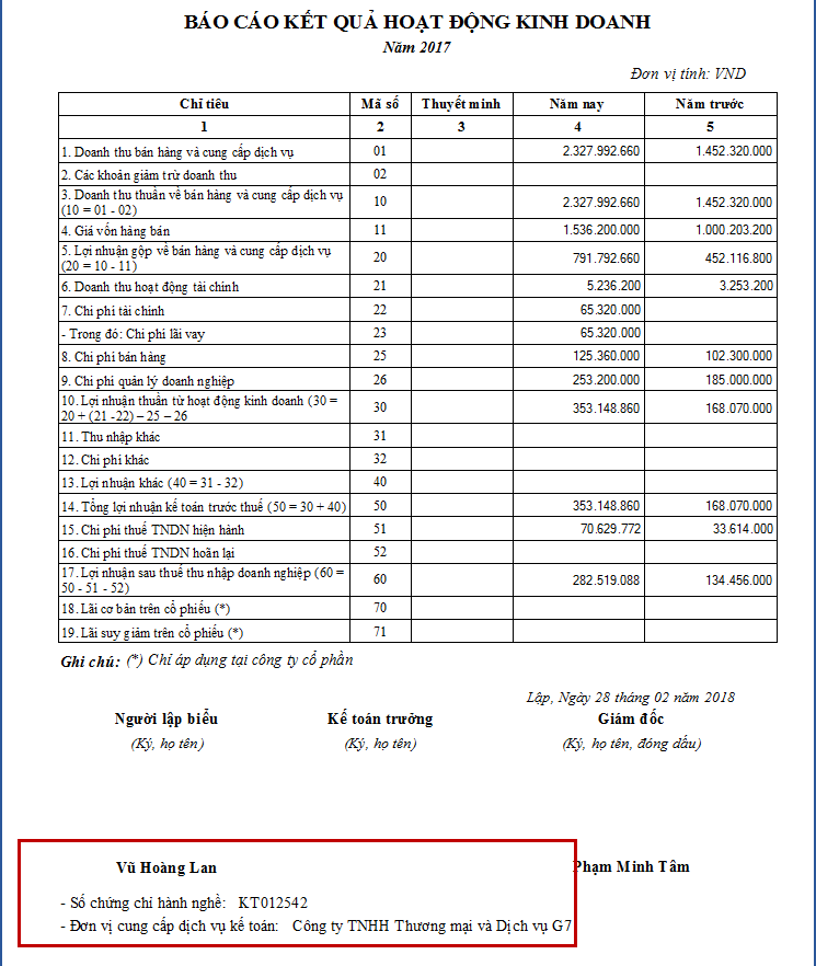 Báo cáo tài chính in ra sẽ thể hiện thông tin đơn vị cung cấp dịch vụ kế toán đã khai báo ở trên.
