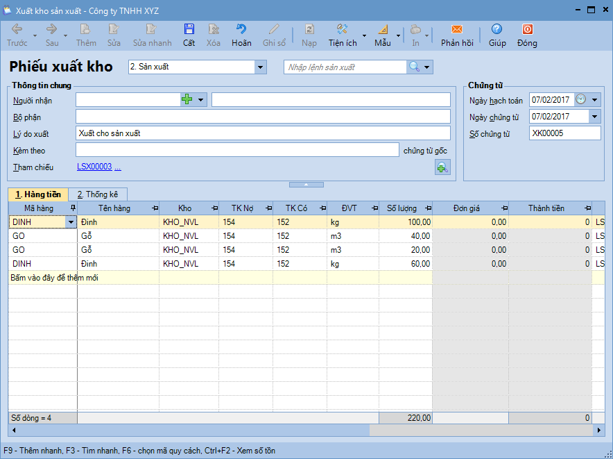 Bước 3: Xuất kho nguyên vật liệu sản xuất