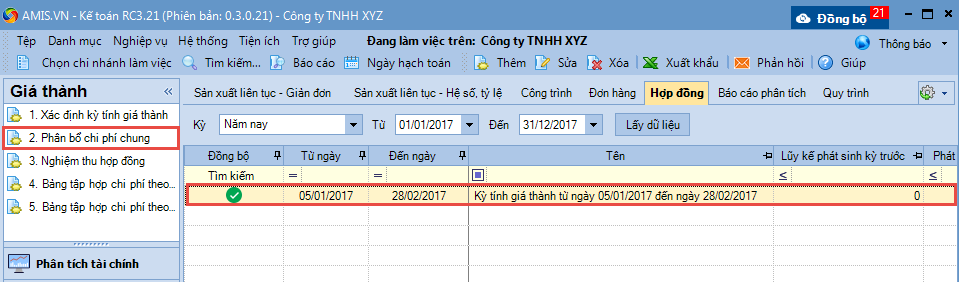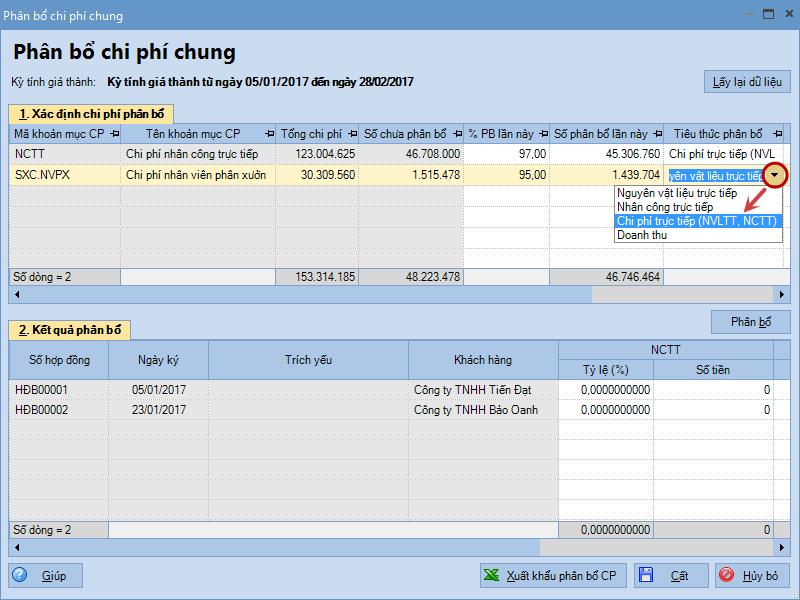 1. Vào phân hệ Giá thành\tab Hợp đồng, nhấn Phân bổ chi phí chung.