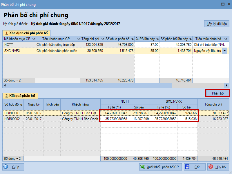 4. Nhấn Phân bổ, chương trình sẽ tự động phân bổ chi phí của từng khoản mục chi phí trên tab Xác định chi phí phân bổ cho các Đơn hàng trên tab Kết quả phân bổ theo tiêu thức phân bổ đã chọn.