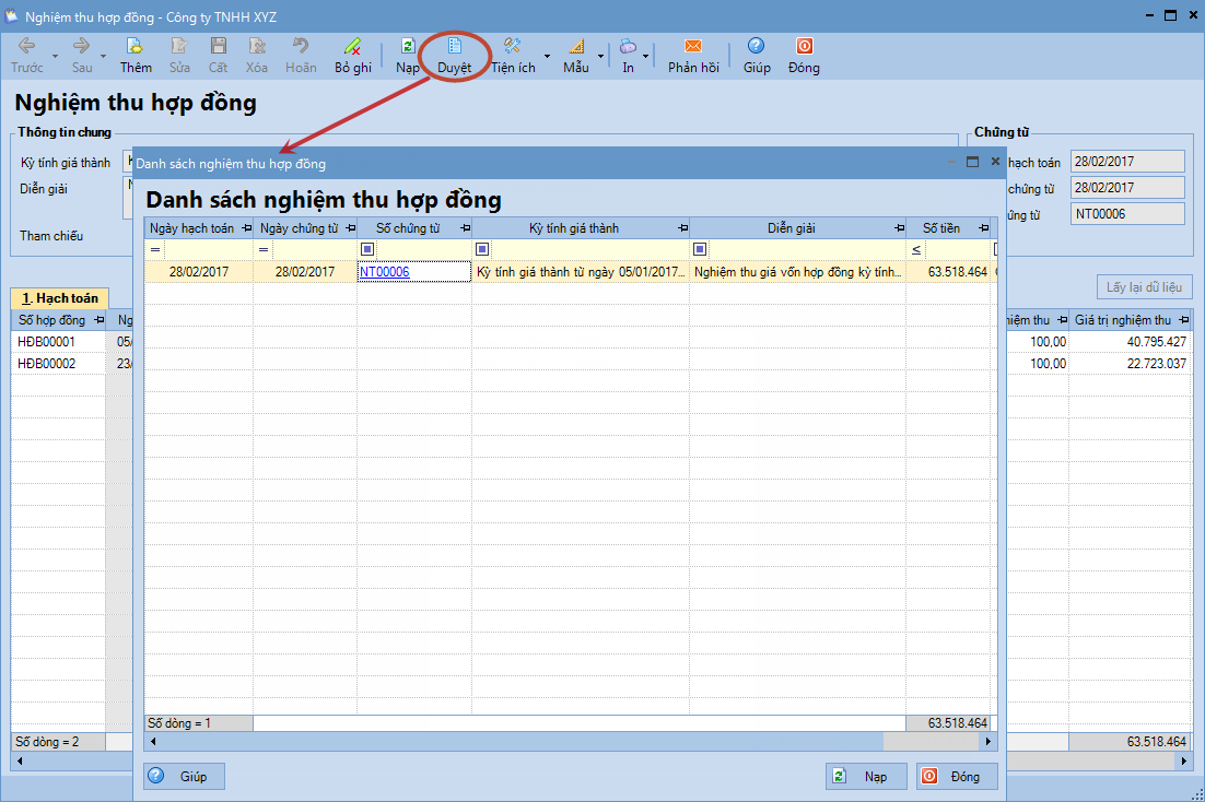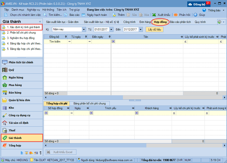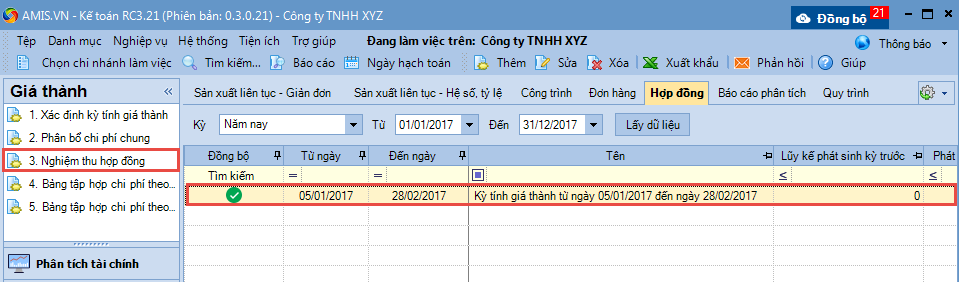 3. Nhấn Lấy dữ liệu, chương trình sẽ tự động lấy lên những hợp đồng bán có phát sinh trong thời gian thuộc kỳ tính giá thành.