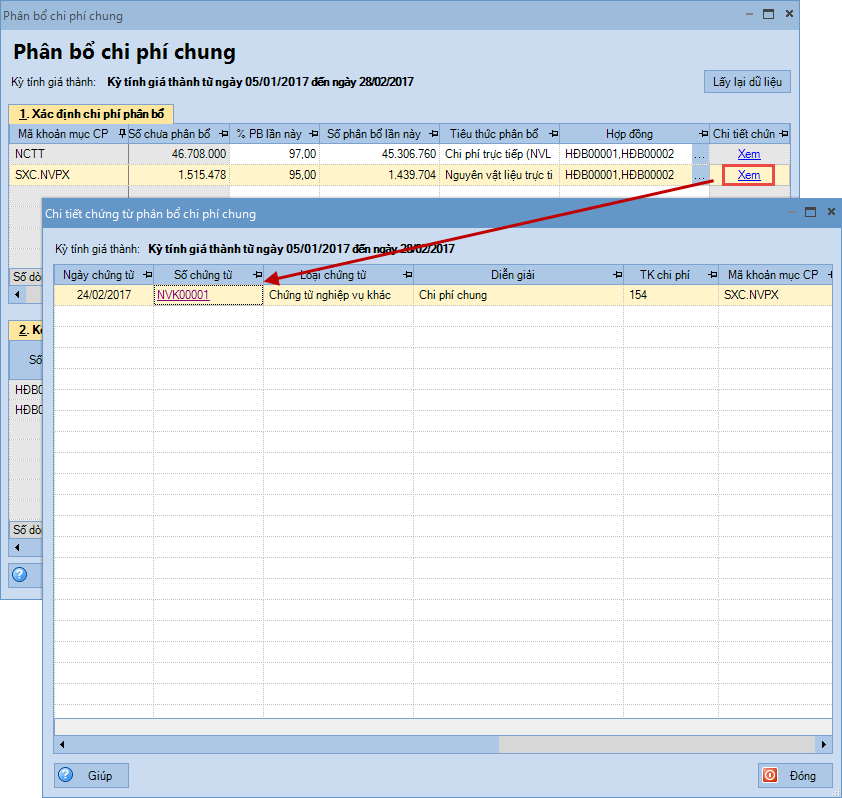 Có thể kiểm tra danh sách chứng được tổng hợp để phân bổ chi phí chung bằng cách sử dụng chức năng Xem tại cột Chi tiết chứng từ trên tab Xác định chi phí phân bổ.