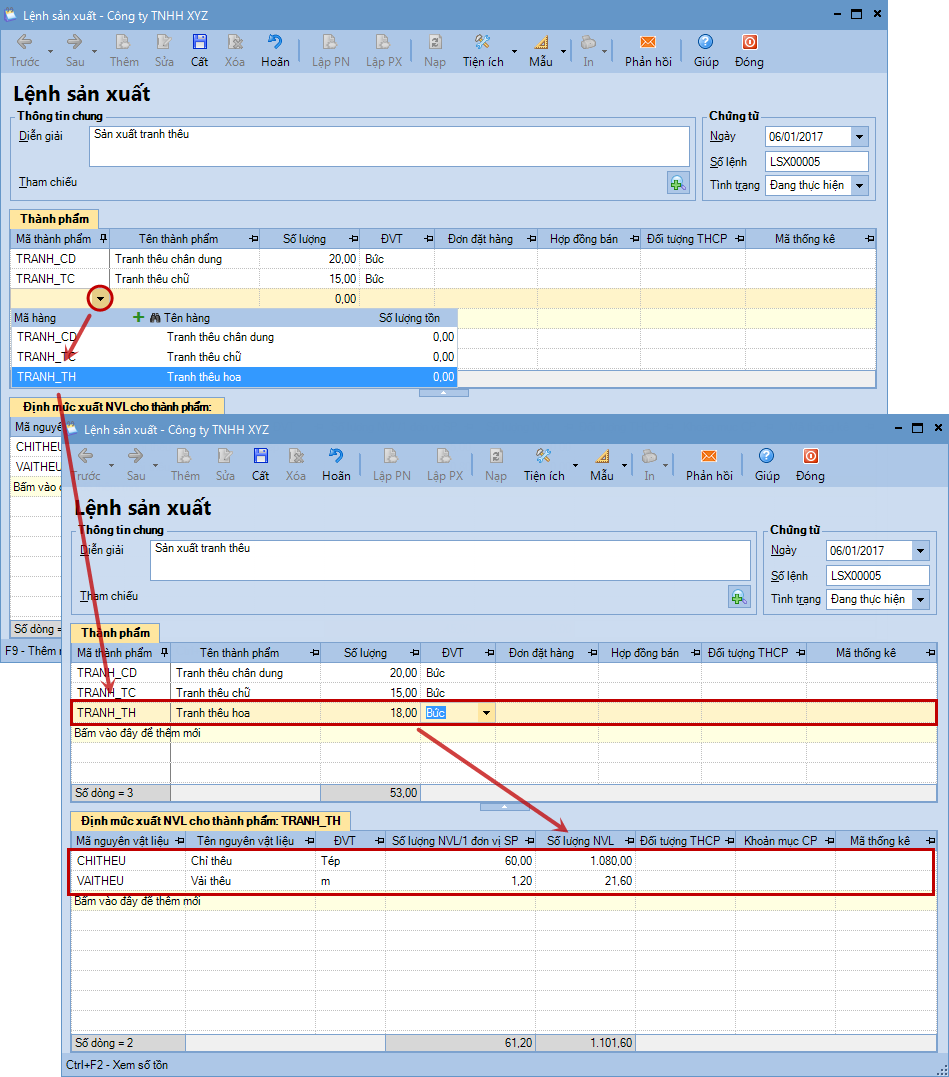 cứ vào thông tin định mức NVL đã được thiết lập ở Bước 1.