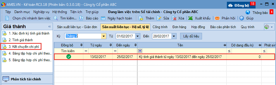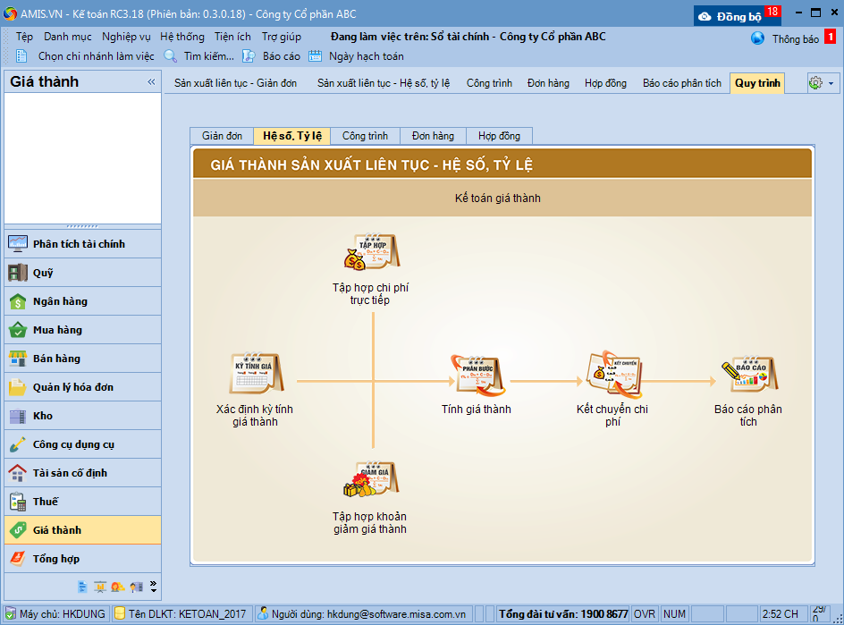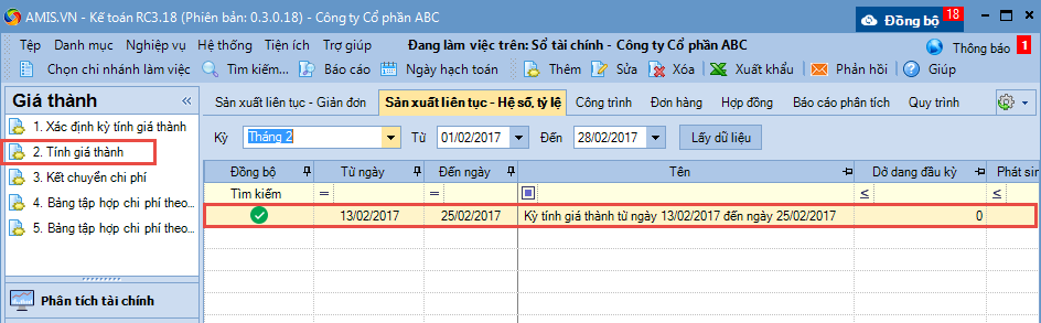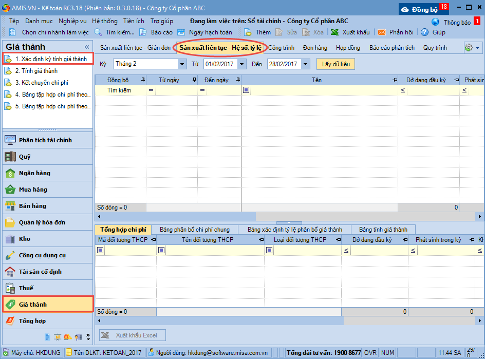 1. Vào phân hệ Giá thành\tab Sản xuất liên tục - Hệ số, tỷ lệ, nhấn Tính giá thành.
