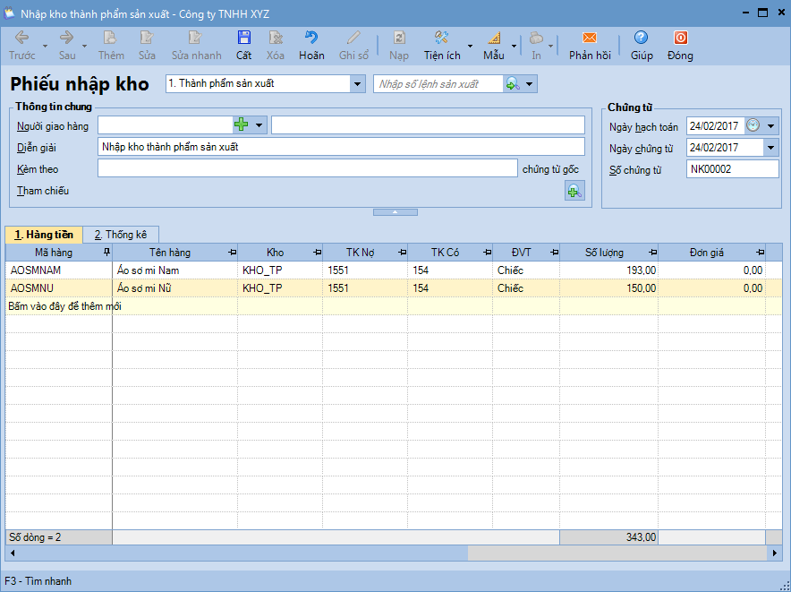 2. Khai báo chứng từ nhập kho thành phẩm.