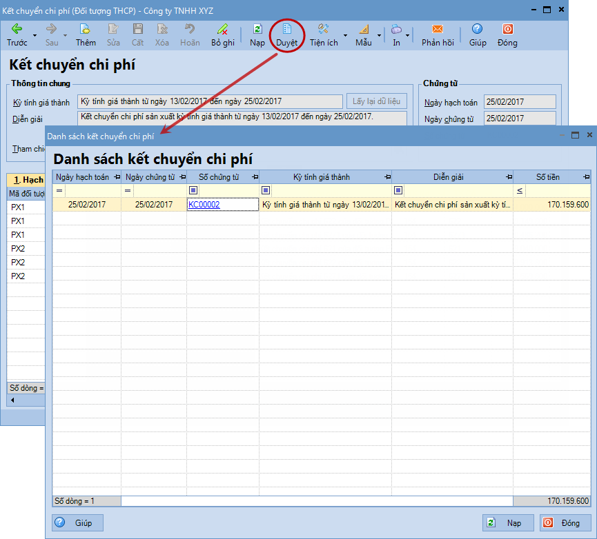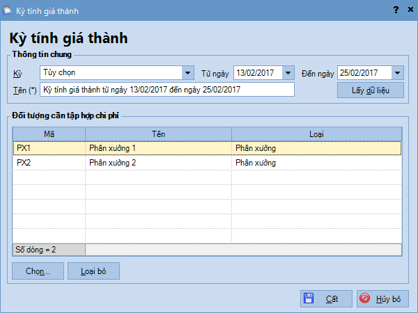 3. Nhấn Lấy dữ liệu, chương trình sẽ tự động lấy lên những đối tượng THCP có phát sinh trong thời gian thuộc kỳ tính giá thành.