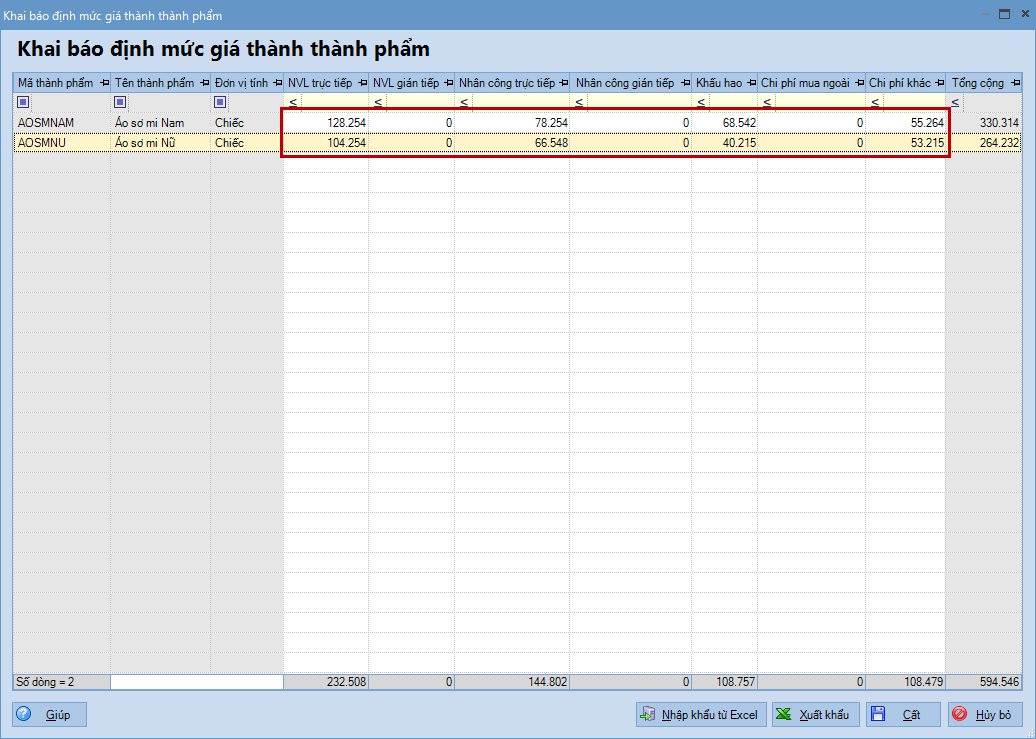 2. Nhập định mức chi phí vào các cột NVL, nhân công, khấu hao, chi phí mua ngoài, chi phí khác cho các đối tượng tính giá thành đã được khai báo cùng đối tượng tập hợp chi phí tại Bước 2.