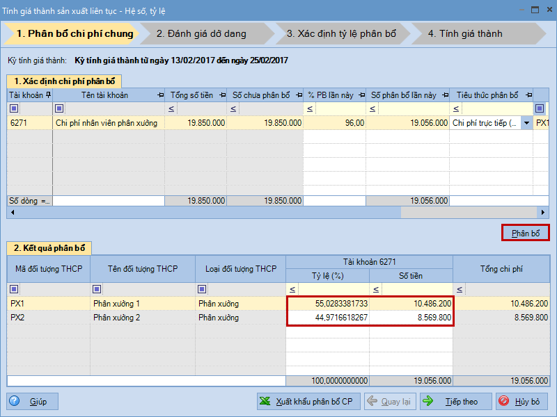 2. Nhấn Phân bổ, chương trình sẽ tự động phân bổ chi phí của từng TK trên tab Xác định chi phí phân bổ cho các đối tượng THCP trên tab Kết quả phân bổ theo tiêu thức phân bổ đã chọn.