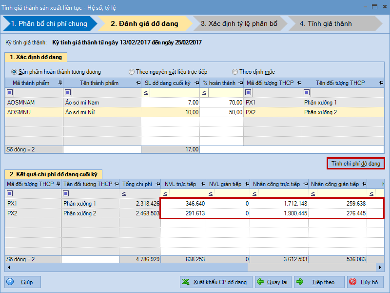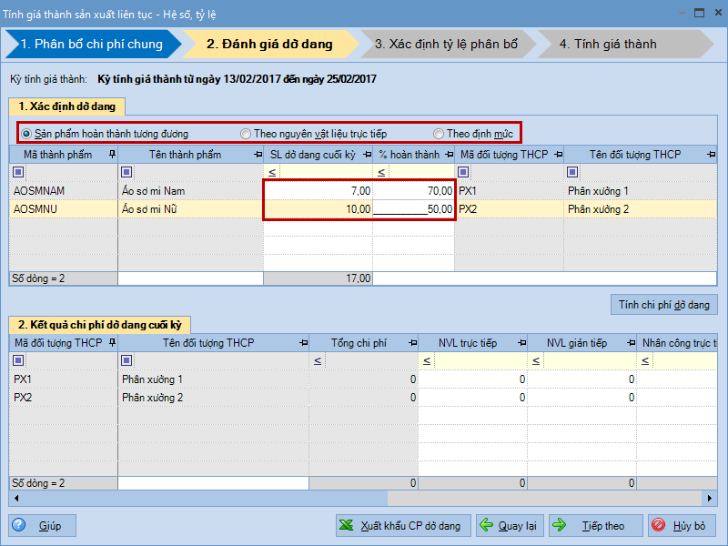 2. Nhập số lượng thành phẩm dở dang và tỷ lệ hoàn thành của các thành phẩm dở dang đó.
