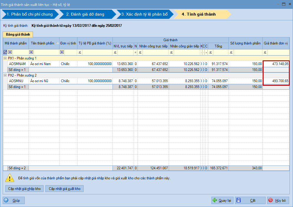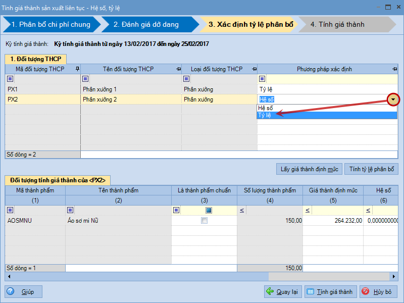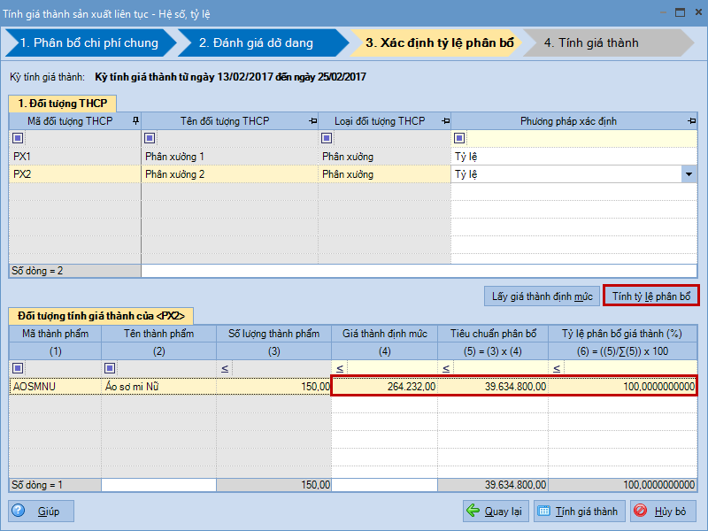 4. Nhấn Tính giá thành để chuyển sang bước Xác định tỷ lệ phân bổ.