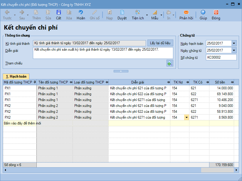 Chương trình sẽ tổng hợp các chứng từ xuất kho NVL (TK 621), hạch toán chi phí lương (TK 622), chi phí sản xuất chung (TK 627) chưa có thông tin Đối tượng THCP để thực hiện việc phân bổ: