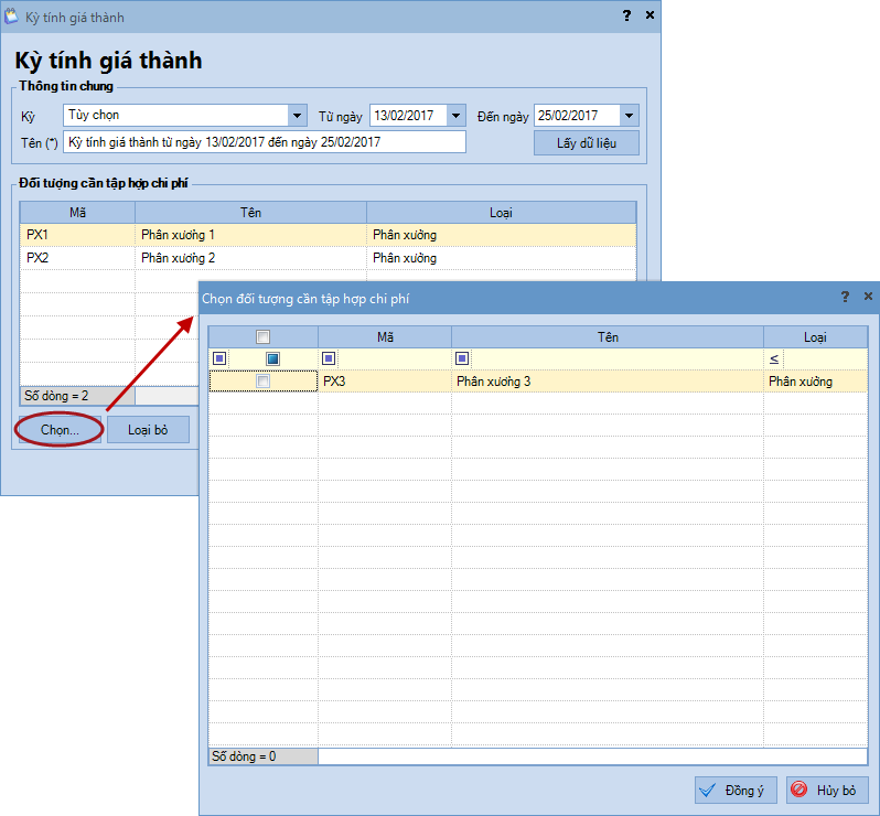 2. Chọn kỳ tính giá thành và nhấn Đồng ý.