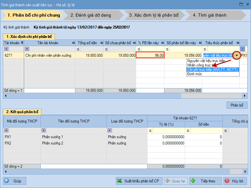 1. Nhập tỷ lệ phân bổ và lựa chọn 1 trong 4 tiêu thức phân bổ: Nguyên vật liệu trực tiếp, Nhân công trực tiếp, Chi phí trực tiếp và Định mức.
