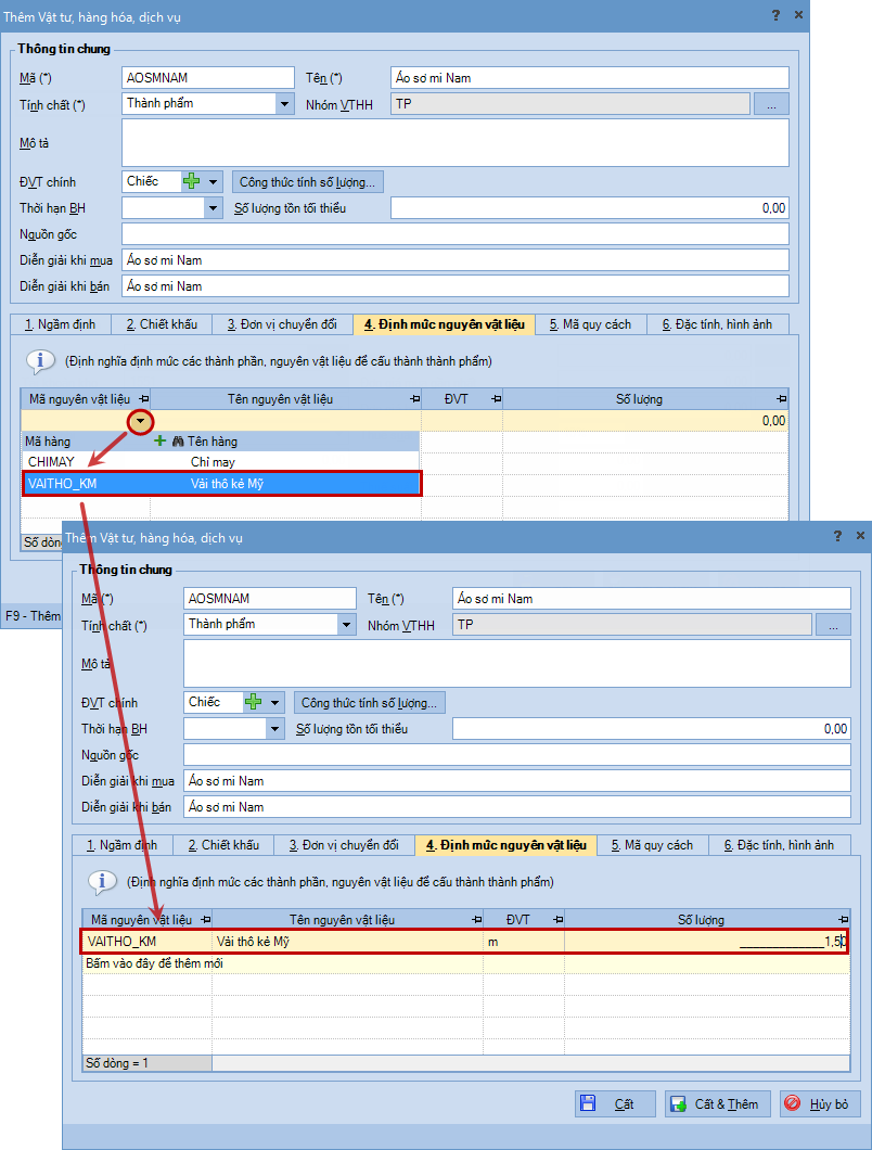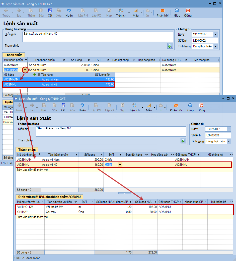 Chọn các thành phẩm và nhập số lượng cần sản xuất, hệ thống sẽ tự động tính ra số lượng nguyên vật liệu cần để sản xuất căn cứ vào thông tin định mức NVL đã được thiết lập ở Bước 1.