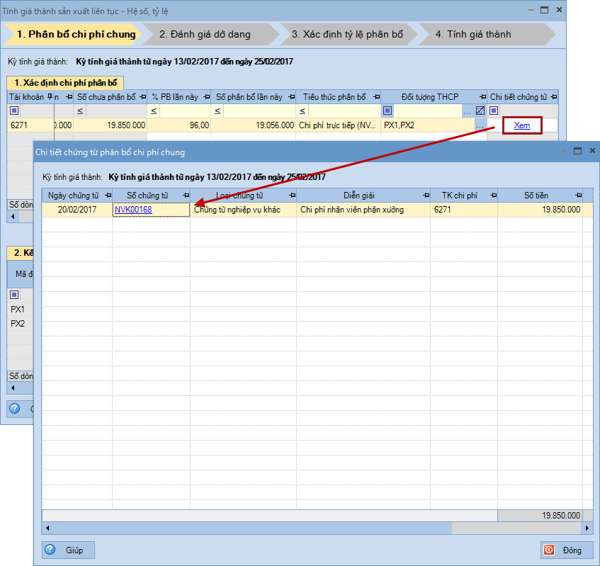 Có thể kiểm tra danh sách chứng được tổng hợp để phân bổ chi phí chung bằng cách sử dụng chức năng Xem tại cột Chi tiết chứng từ trên tab Xác định chi phí phân bổ.