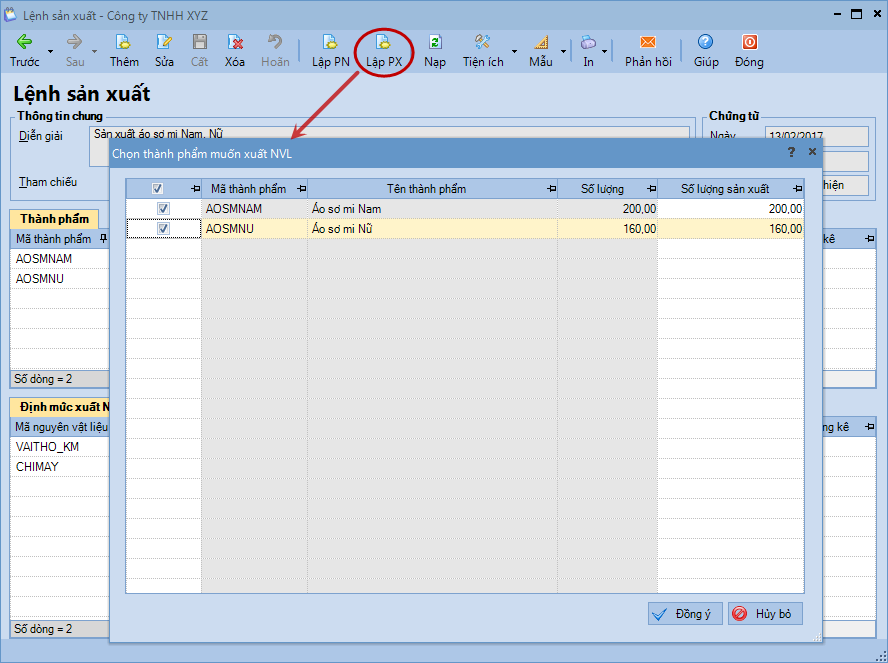 5 Tích chọn các thành phẩm cần xuất NVL, nhấn Đồng ý.