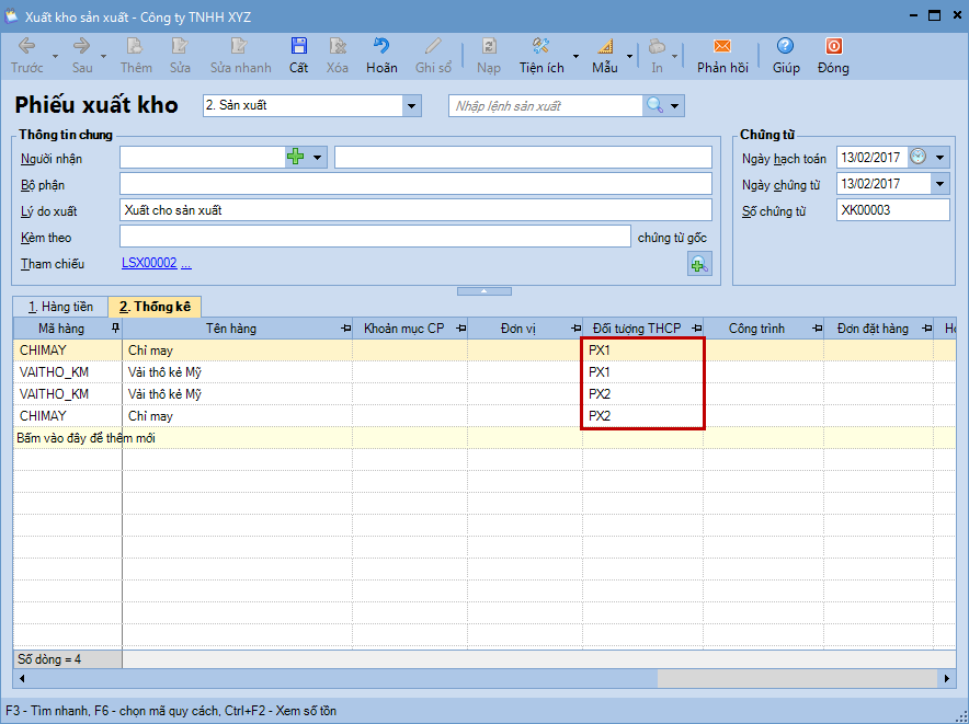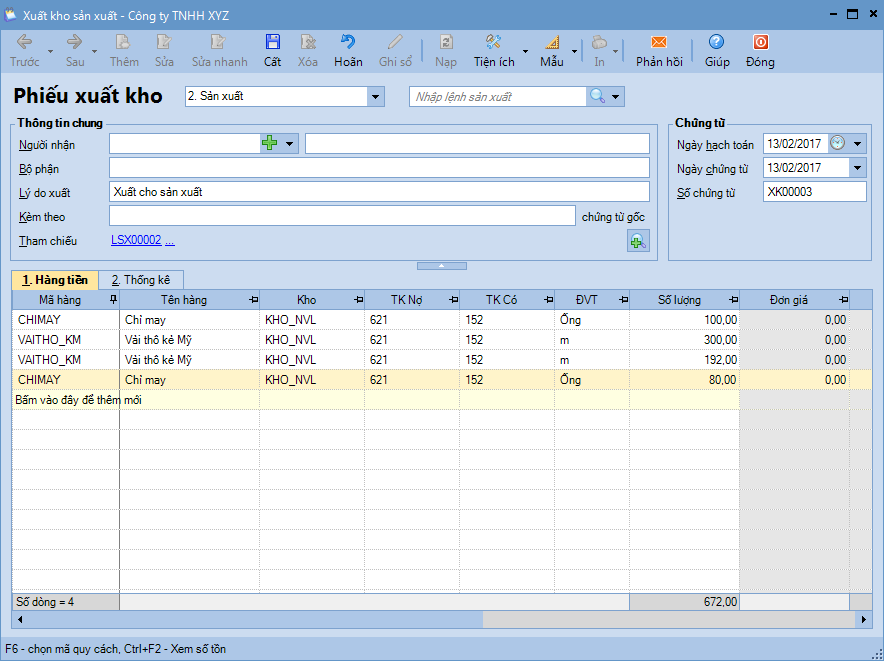 Nhập bổ sung các thông tin còn thiếu cho chứng từ xuất kho như lý do xuất, TK Nợ,...